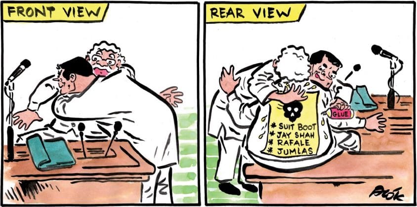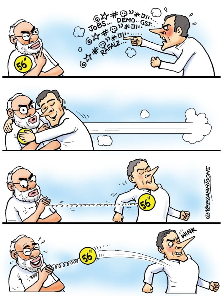 नीलभ बनर्जी दर्शाते हैं कि राहुल गांधी द्वारा आँख मार के मोदी के गले मिलने के प्रभाव को कम कर दिया।