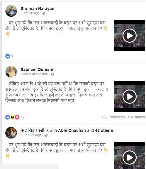 यह वीडियो ट्विटर और फेसबुक पर कई बार पोस्ट किया गया और व्हाट्सएप पर भी वायरल हो रहा है। व्हाट्सएप पर फॉरवर्ड किए जाने सहित वीडियो के साथ अधिकांश पोस्ट में कैप्शन में यह शेयर किया जा रहा है कि “आत्महत्या करने से पहले पुलिस ने कश्मीर में एक आत्मघाती आतंकवादी की हत्या कर दी। वहां के मुस्लिमों ने उसे मसीहा बताकर उस आतंकवादी के जनाजे में भारी मात्रा में एकत्र हुए, पर यह भूल गए कि उस आतंकवादी के शरीर पर अभी भी सुसाइड बम बंधा हुआ है जो एक्टिवेट है। इसके मेसेज के अंत में लिखा है “अल्लाह हू अकबर? ”