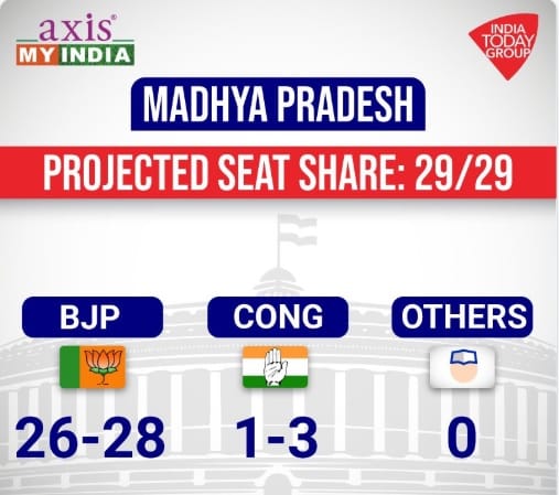 नई दिल्ली: एग्ज़िट पोल के आंकड़ों के अनुसार मध्यप्रदेश अब भी भाजपा के साथ नज़र आ रहा है. एबीपी न्यूज़ के पोल के अनुसार मध्यप्रदेश में 29 सीटों में भाजपा के पास 24 और कांग्रेस को 5 सीटें मिलने का अनुमान है. आजतक के अनुसार 26-28 सीटें भाजपा के पाले में जा रही हैं, तो कांग्रेस को 1-3 सीटें मिल रही हैं. न्यूज़ 24 चाणक्या पोल ने भाजपा को 27 और कांग्रेस को 2 सीटें दी है.