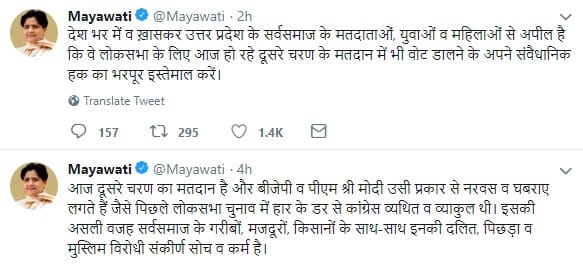 वहीं दूसरी तरफ मायावती ने पीएम मोदी पर निशाना साधते हुए कहा कि आज दूसरे चरण का मतदान है और बीजेपी व पीएम श्री मोदी उसी प्रकार से नरवस व घबराए लगते हैं जैसे पिछले लोकसभा चुनाव में हार के डर से कांग्रेस व्यथित व व्याकुल थी. इसकी असली वजह सर्वसमाज के गरीबों, मजदूरों, किसानों के साथ-साथ इनकी दलित, पिछड़ा व मुस्लिम विरोधी संकीर्ण सोच व कर्म है.