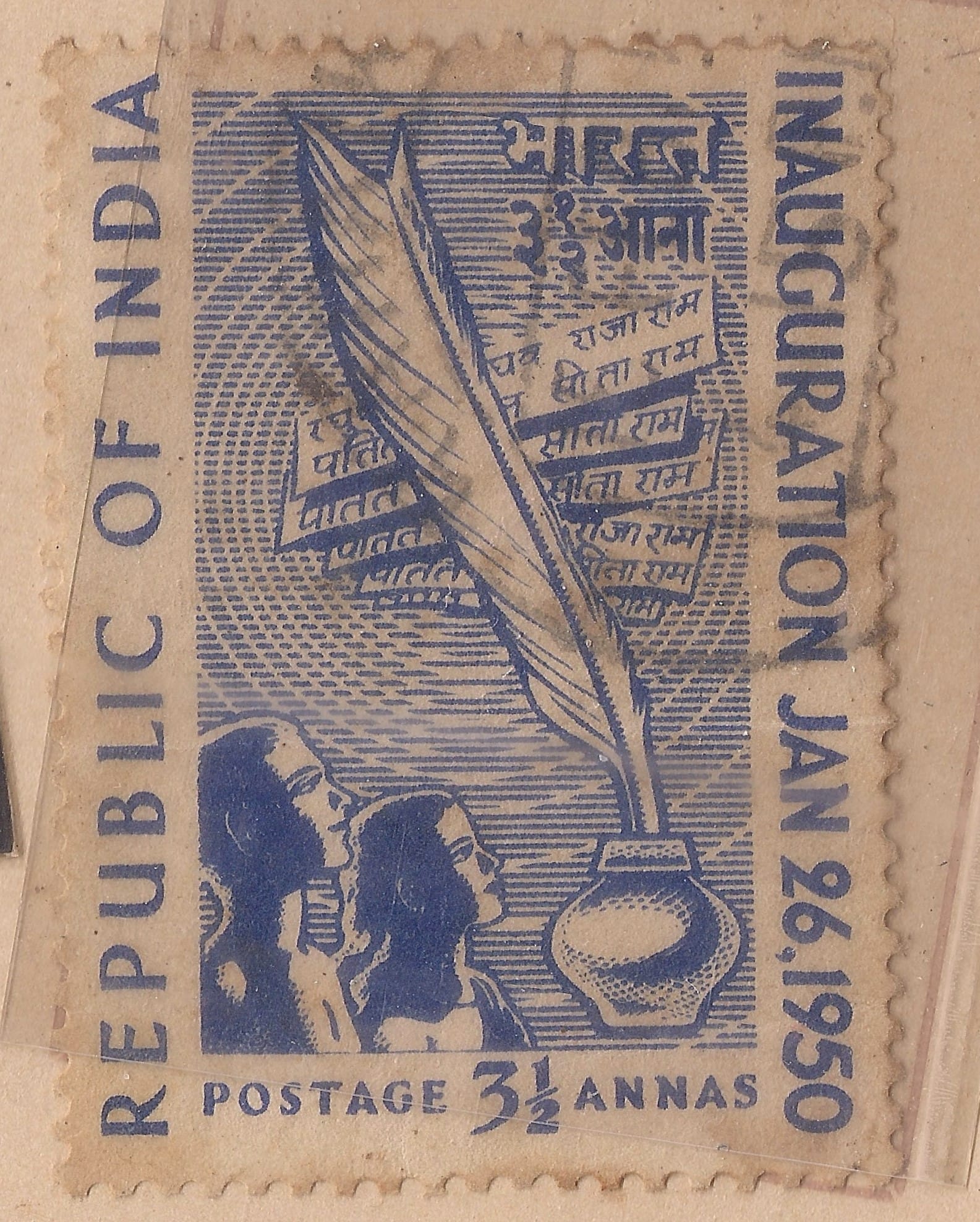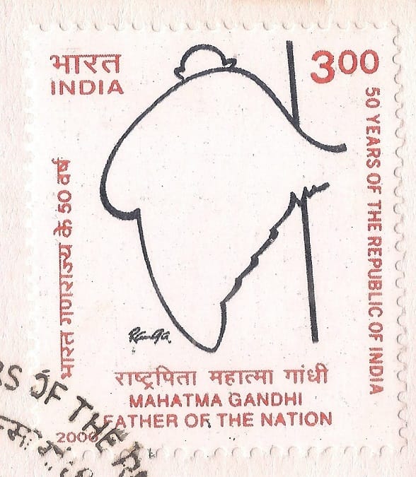 1950 में गणतंत्र की स्थापना के उपलक्ष्य में जारी चार टिकटों में एक पर चरखा तथा दूसरे पर गांधी का प्रिय भजन ‘रघुपति राघव राजा राम’ अंकित था. इसके बाद एक लम्बे समय तक टिकटों पर गांधी का सन्देश सत्याग्रह और चरखे तक सीमित रहा. लेकिन इस बीच में पोस्टकार्ड और अन्तर्देशीय पत्र पर छपे आदर्श वाक्यों एवं टिकटों के विरूपण के ज़रिये उनके विचार लोगों तक पहुंचते रहे.