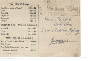 तिलक की ‘गीता रहस्य’और अन्य किताबें (पुणे से जयपुर भेजा गया पोस्टकार्ड) – 1968 |