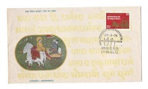 25 पैसे के हल्के चमकीले नारंगी और सुनहरे रंग के डाक टिकट पर श्रीमद् भगवद्गीता के दूसरे अध्याय के एक बहुप्रसिद्ध श्लोक का पहला भाग ‘कर्मण्येवाधिकारस्ते मा फलेषु कदाचन’ उद्धृत है. अक्सर हम इसे ही कर्म का सिद्धांत मान लेते हैं. लेकिन श्लोक के दूसरे भाग ‘मा कर्मफलहेतुर्भूर्मा ते सङ्गोSस्त्वकर्मणि’ को साथ लेकर ही इसकी सही विवेचना की जा सकती है अर्थात् कर्म करें और फल का मोह न करें, किन्तु फल का मोह न होने का यह तात्पर्य नहीं है कि कर्म करने से मुंह मोड़ लें.
