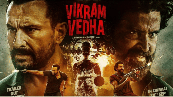 ‘बेताल पच्चीसी’ की विक्रम-बेताल वाली कहानियां हम भारतीयों के लिए नई नहीं हैं जिनमें राजा विक्रमादित्य की पीठ पर सवार बेताल उन्हें कोई कहानी सुना कर सवाल पूछता है और कहता है कि जवाब मालूम होने पर भी चुप रहे तो मरोगे और अगर बोले तो मैं वापस चला जाऊंगा. फिल्म के शुरू में दो मिनट के एनिमेशन से यह सब बताया भी गया है. 2017 में आई आर. माधवन-विजय सेतुपति वाली इसी नाम की तमिल फिल्म के इस रीमेक में विक्रम और वेधा के बीच उसी तरह कहानियों का वर्णन और अंत में आने वाले धर्मसंकट की बात दिखाई गई है. यह फिल्म दरअसल पाप-पुण्य, गलत-सही, काले-सफेद, चोर-पुलिस के बीच की उसी शाश्वत लड़ाई को दिखाती है जो हम राम-रावण के समय से देखते-सुनते आए हैं.