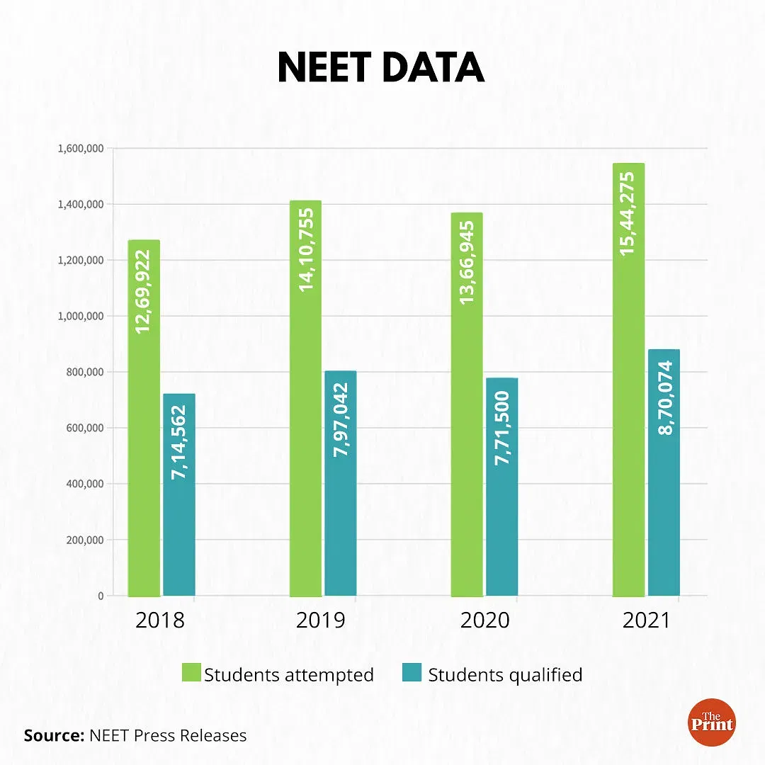 भारत में 2018 से 2021 तक औसतन, 7.8 लाख छात्रों ने मेडिकल कॉलेज में प्रवेश के लिए राष्ट्रीय पात्रता सह प्रवेश परीक्षा (नीट) पास की. हालांकि, इन 7 लाख से अधिक छात्रों के लिए देशभर में सरकारी और निजी संस्थानों में केवल 80,000 मेडिकल कॉलेज सीटें ही उपलब्ध रही हैं.