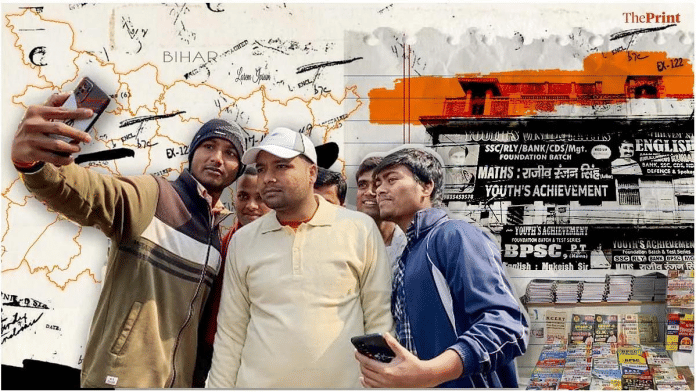 पटना: पटना के मुसल्लाहपुर हाट में मुख्य सड़क पर टहलते हुए आपको एक व्यस्त सा बाज़ार दिखाई देगा जिसके ऊपर तारों का गुत्थम-गुत्था हुआ व्यूह लटका दिखता है. लगभग हर प्रतियोगी परीक्षा के लिए गाइडबुक की अंतहीन पंक्तियों वाली दुकानें दिखेंगी और उनके भी ऊपर बड़े-बड़े होर्डिंग – राजनीतिक नेताओं या फिल्मी सितारों के नहीं, बल्कि कोचिंग सेंटर चलाने वाले शिक्षकों की – लगी मिलेंगीं. इन शिक्षकों को भगवान की तरह सम्मान दिया जाता है क्योंकि वे ही इन अभ्यर्थियों को उन परीक्षाओं को पास करने में मदद कर सकते हैं जो उन्हें सरकारी नौकरी दिलाएंगे, चाहे वह रेलवे की हो, बैंकिंग जगत में हो या फिर सिविल सेवाओं में हो.