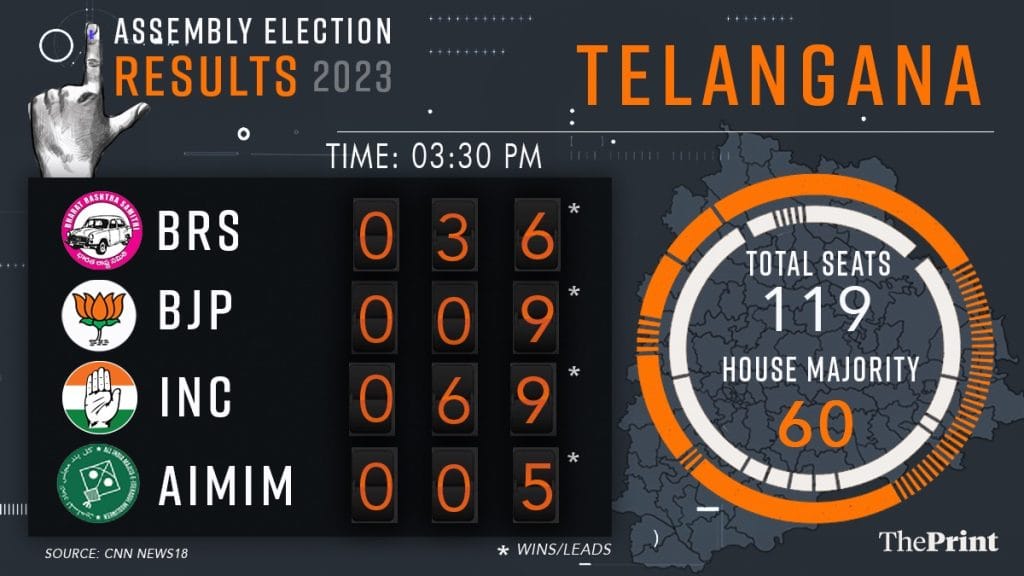 कांग्रेस 58, भारत राष्ट्र समिति 33, भारतीय जनता पार्टी (भाजपा) सात और मार्क्सवादी कम्युनिस्ट पार्टी (माकपा) एक सीट पर आगे है.