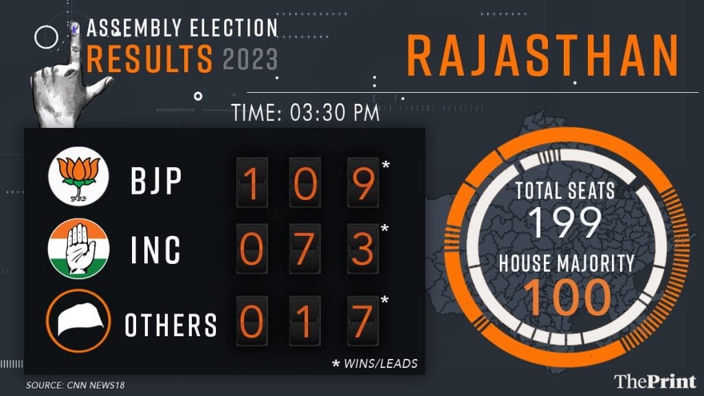 12:20 PM: राजस्थान में बीजेपी के प्रदेश महामंत्री भजनलाल शर्मा ने फोन पर दिप्रिंट से कहा, ”राज्य में बीजेपी की सरकार बनने जा रही है. जनता ने युवा विरोधी, महिला विरोधी सरकार को उखाड़ फेंका है और अंतिम नतीजों के साथ हम कांग्रेस को नेस्तनाबूद करने जा रहे हैं.”
