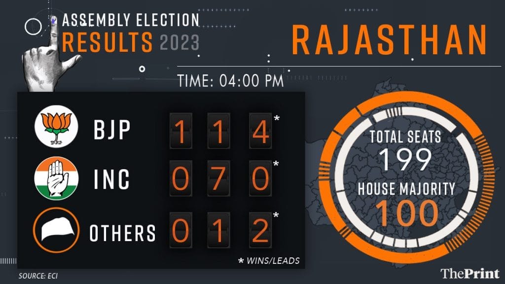 नई दिल्ली: निर्वाचन आयोग के मुताबिक, राजस्थान की 199 विधानसभा सीटों में भाजपा 103 सीटें जीत चुकी है और 12 सीटों पर आगे चल रही है जबकि कांग्रेस 58 सीटें जीत चुकी है और 11 सीटों पर आगे चल रही है.