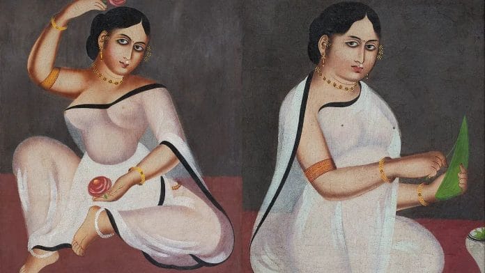 सफेद रंग की साड़ी पहने इन रत्नजड़ित महिलाओं को वायलिन या तबला बजाते हुए, पान बनाते हुए, और अपने बालों में गुलाब से लगाते हुए —’पान सुंदरी’ एवं ‘गुलाब सुंदरी’ — हुए चित्रित किया गया था. वे दाहिने पैर में घुंघरू (पाजेब) पहनती थीं, बिल्कुल मुगल तवायफों की तरह. वे विधवाएं और वेश्याएं थीं. और उनकी इस दोहरी पहचान में महान सांस्कृतिक विघटन की कहानी अंतर्निहित थी.