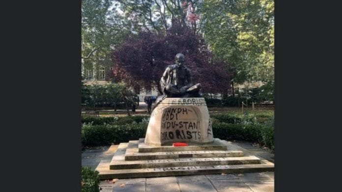 1968 में टैविस्टॉक स्क्वायर में लगाई गई कांस्य मूर्ति में गांधी ध्यानमग्न मुद्रा में बैठे हैं. सोमवार को मूर्ति के आधार पर यह लिखा देखा गया: “Gandhi-Modi Hindustani Terrorists.”