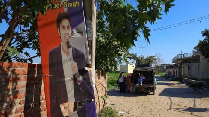 ताजपुर गांव के प्रवेश द्वार पर आंबेडकर और भगत सिंह की तस्वीरें बनी हैं. बड़े मकानों से घिरी एक मध्यम आकार की सड़क, घरों के आकार में कमी आने के साथ कम चौड़ी होती जाती है. फिर गड्ढे और कच्चा रास्ता आता है, जिसके बीच-बीच में खुले मैदान हैं, जो मिनिस्ट्री तक पहुंचते हैं. एक अकेला फटा हुआ, लम्बा बोर्ड जिस पर बजिंदर सिंह माइक पर बोलते हुए दिखाई दे रहे हैं, एक खंभे से बंधा हुआ है.