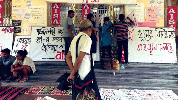 कोलकाता: जादवपुर विश्वविद्यालय में एक दर्जन छात्र बंद प्रशासनिक भवन के बाहर बांग्ला में लिखे पोस्टर के साथ ‘न्याय’ और ‘रैगिंग मुक्त’ परिसर की मांग करते हुए एकत्र हुए. उनमें से कोई भी उस 17-वर्षीय छात्र को जानता नहीं था. उन्हें कभी जानने का मौका भी नहीं मिला. वह 9 अगस्त की शाम को मुख्य लड़कों के हॉस्टल के बाहर मृत पाया गया, देश के शीर्ष संस्थानों में से एक में प्रथम वर्ष के छात्र के रूप में उसका दूसरा दिन पता नहीं कैसा ही रहा होगा.