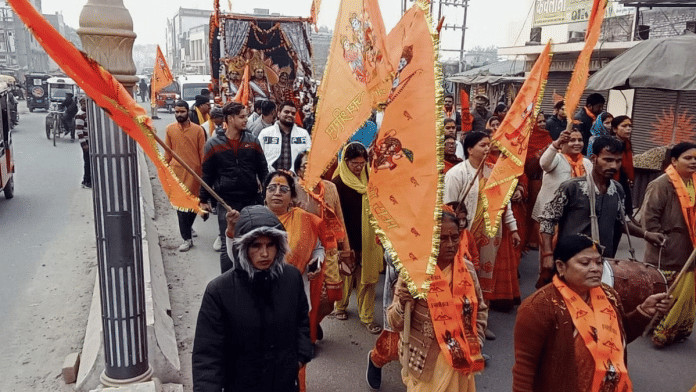 प्राण प्रतिष्ठा के दिन भगवाधारी दुर्गा वाहिनी सदस्यों द्वारा अयोध्या की सड़कों पर कतार लगाते हुए, गणमान्य व्यक्तियों और प्रधानमंत्री नरेंद्र मोदी का स्वागत करने का महिलाओं का सपना धूमिल होता जा रहा है.