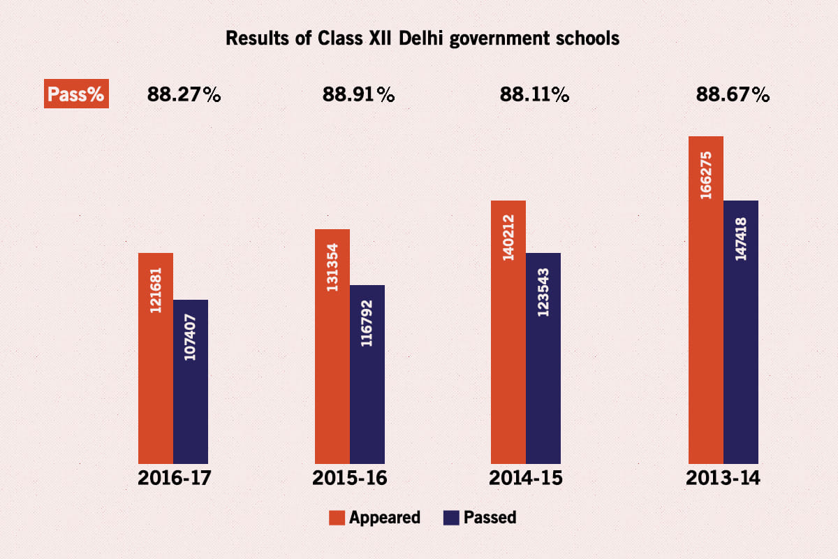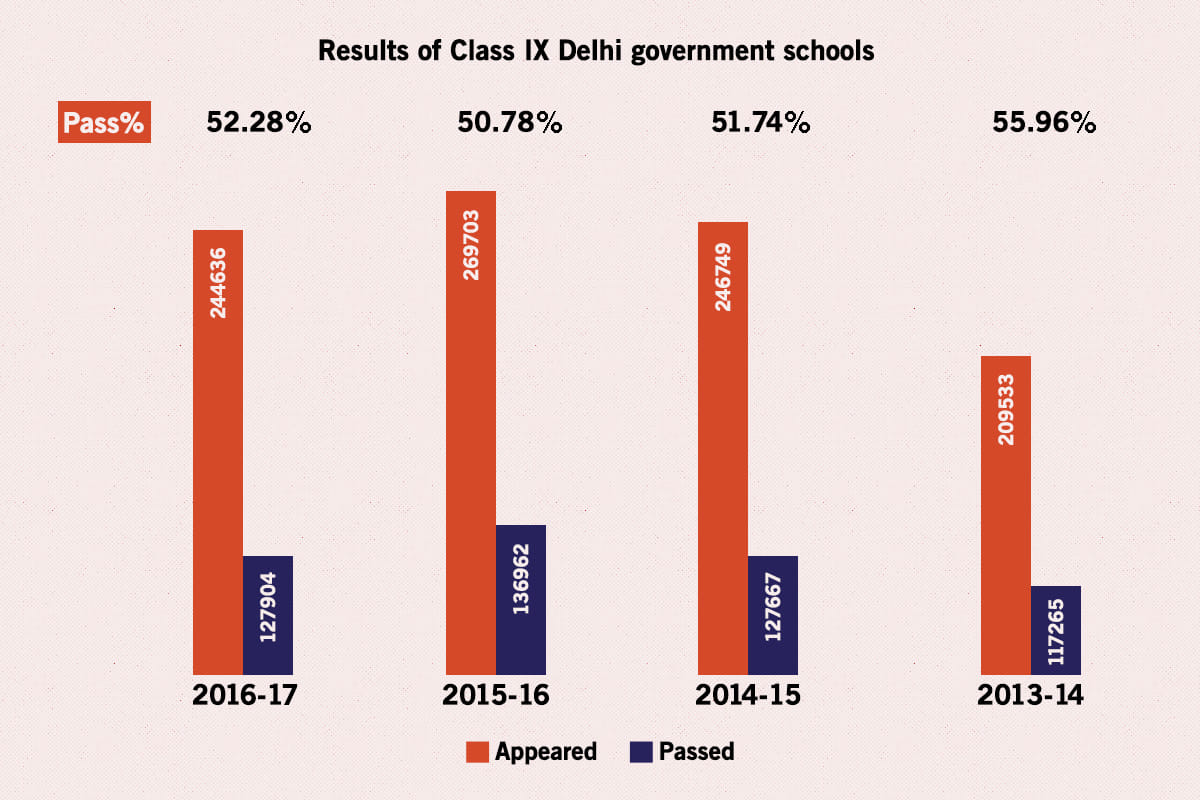 दिल्ली के सरकारी स्कूलों में पिछले चार वर्षों से कक्षा 12 में कुल पास प्रतिशत लगातार 88 प्रतिशत से ऊपर रहा है, तो वहीं कक्षा 9 में पास प्रतिशत आधे के आसपास आ गया है।