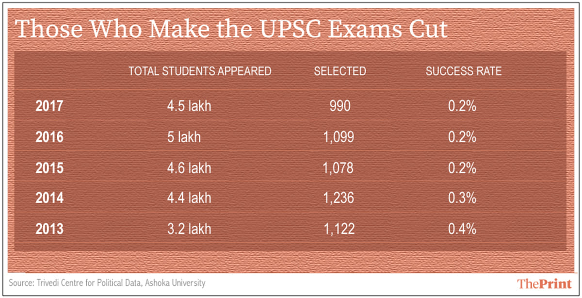 2017 का उदाहरण ही देख लें। जहां प्रारंभिक परीक्षा के लिए उपस्थित 4.5 लाख उम्मीदवारों में से, अंत में केवल 909 को ही चुना गया था – सफलता का प्रतिशत केवल 0.2 प्रतिशत था। यह दर पिछले कुछ वर्षों में इस तरह के कमजोर प्रतिशत के आस-पास चक्कर काट रही है।