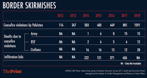 इस बीच में पाकिस्तान द्वारा सीजफायर उल्लंघन की घटनाएं पिछले छह वर्षों में करीब 15 गुना बढ़ी हैं. 2018 में 1591 घटनाएं (अब तक) 2017 में दर्ज कुल घटनाओं के मुकाबले लगभग दोगुनी हैं. 2017 में भी दर्ज सीजफायर उलंघन की घटनाएं 2016 का लगभग दोगुनी थीं.