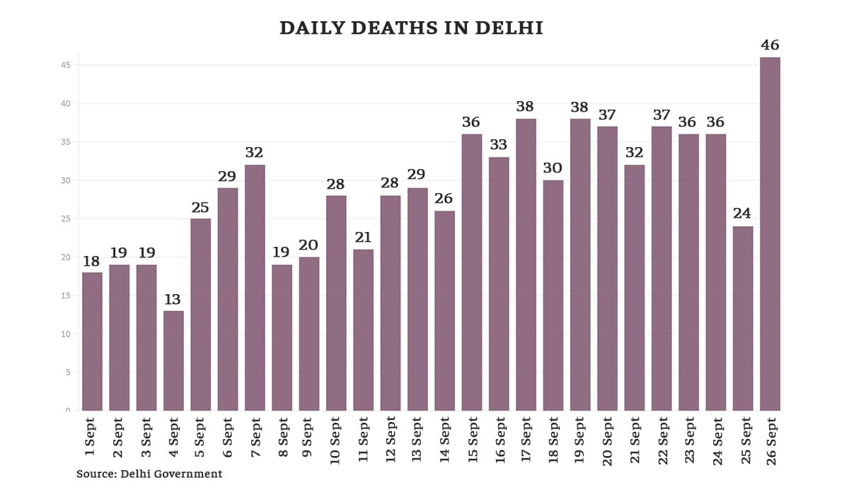 सितंबर के महीने में राष्ट्रीय राजधानी में मरनेवालों की संख्या दोगुने से अधिक हो गई है. अकेले पिछले सप्ताह में, मरने वालों की संख्या 19 सितंबर को 38 से बढ़कर, 26 सितंबर को 46 पहुंच गई.