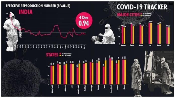 नई दिल्ली: भारत में कोविड के लिए ‘प्रभावी रीप्रोडक्शन नंबर या आर एक संकेतक है जो संक्रमण कितनी तेज़ी से फैल रहा है इस बारे में बताता है. इस हफ्ते आर 0.94 पर स्थिर बना रहा हालांकि कर्नाटक जैसे कई प्रांतों में ये वैल्यू उछलकर 1 से ऊपर पहुंच गई.