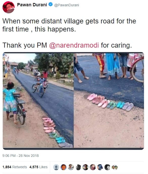मोदी के समर्थक प्रतीत होने वाले दुरानी ने बुधवार को ट्वीट किया जिसका हिंदी अनुवाद कहता है, ‘जब किसी दूर दराज के गांव को पहली बार सड़क नसीब होती है, ऐसा होता है. प्रधानमंत्री मोदी का आपका धन्यवाद.’