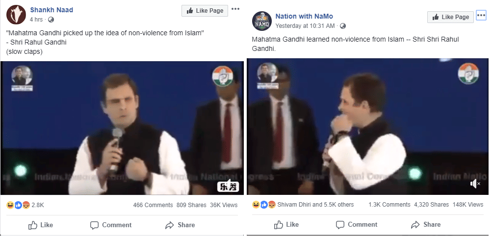 इस 10 सेकंड के वायरल वीडियो क्लिप को ऑरिजिनल वीडियो से काट के निकाला गया है, जिसमें कांग्रेस अध्यक्ष कह रहे हैं, ‘महात्मा गांधी ने अहिंसा की अवधारणा भारत के प्राचीन दर्शनशास्त्रों से ली, इस्लाम से ली.’
