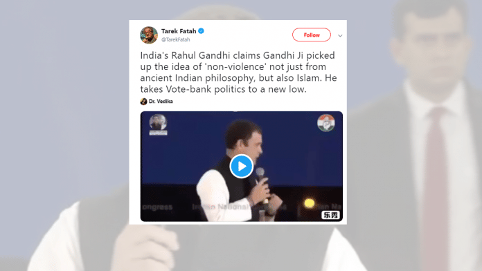 फतह का ट्वीट अंग्रेज़ी में था, जिसका अनुवाद कहता है, ‘भारत के राहुल गांधी यह दावा कर रहे हैं कि गांधी जी ने अहिंसा का विचार सिर्फ प्राचीन भारतीय दर्शनशास्त्र से नहीं, इस्लाम से भी लिया. इन्होंने वोट-बैंक की राजनीति को एक और निम्न स्तर पर ला खड़ा किया है.’