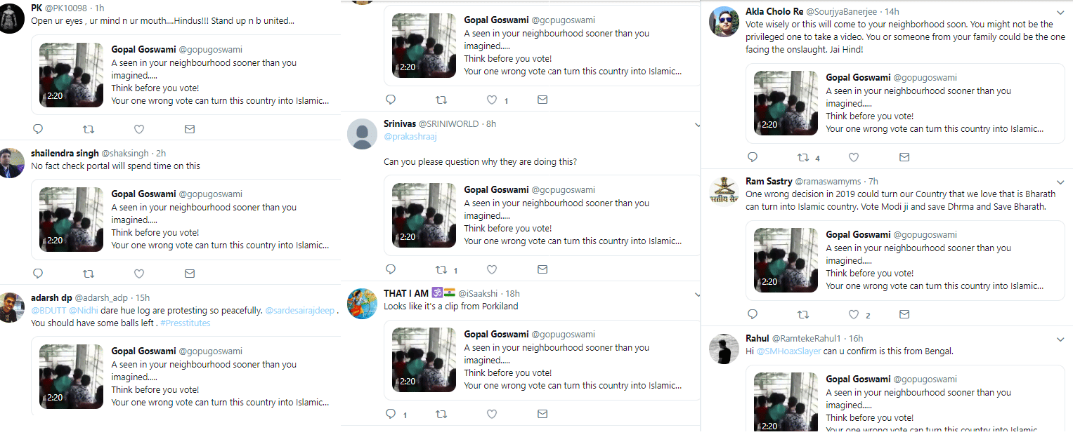 गोस्वामी के ट्वीट ने प्रत्यक्ष रूप से यह तो नहीं बताया कि यह वीडियो कहां का है, लेकिन वीडियो के ही जवाब में उन्होंने स्पष्ट किया कि यह वीडियो ‘बंगाल’ का है.