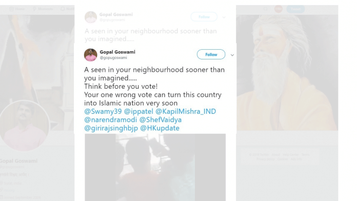 Your one wrong vote can turn this country into Islamic nation very soon @Swamy39 @ippatel @KapilMishra_IND @narendramodi @ShefVaidya @girirajsinghbjp @HKupdate pic.twitter.com/PTXNhZpMWB— Gopal Goswami (@gopugoswami) January 9, 2019
