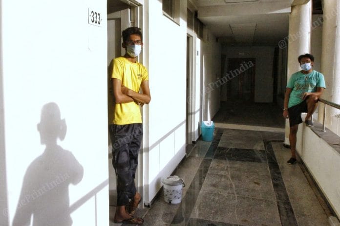 उसने दिप्रिंट को बताया ‘खांसी, थकान, सिरदर्द नहीं है, मैं पहले दिन के बाद से पूरी तरह से ठीक महसूस कर रहा हूं.’ वह अपने कमरे के बाहर और गलियारे में खड़ा था और क्वारंटाइन केंद्र के आंगन को देख रहा था। उसने कहा कि वह ‘टाइम-पास’ के खातिर गलियारे में घूमता रहता है.