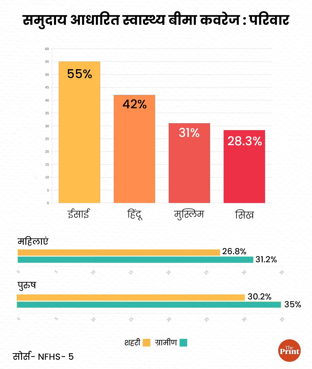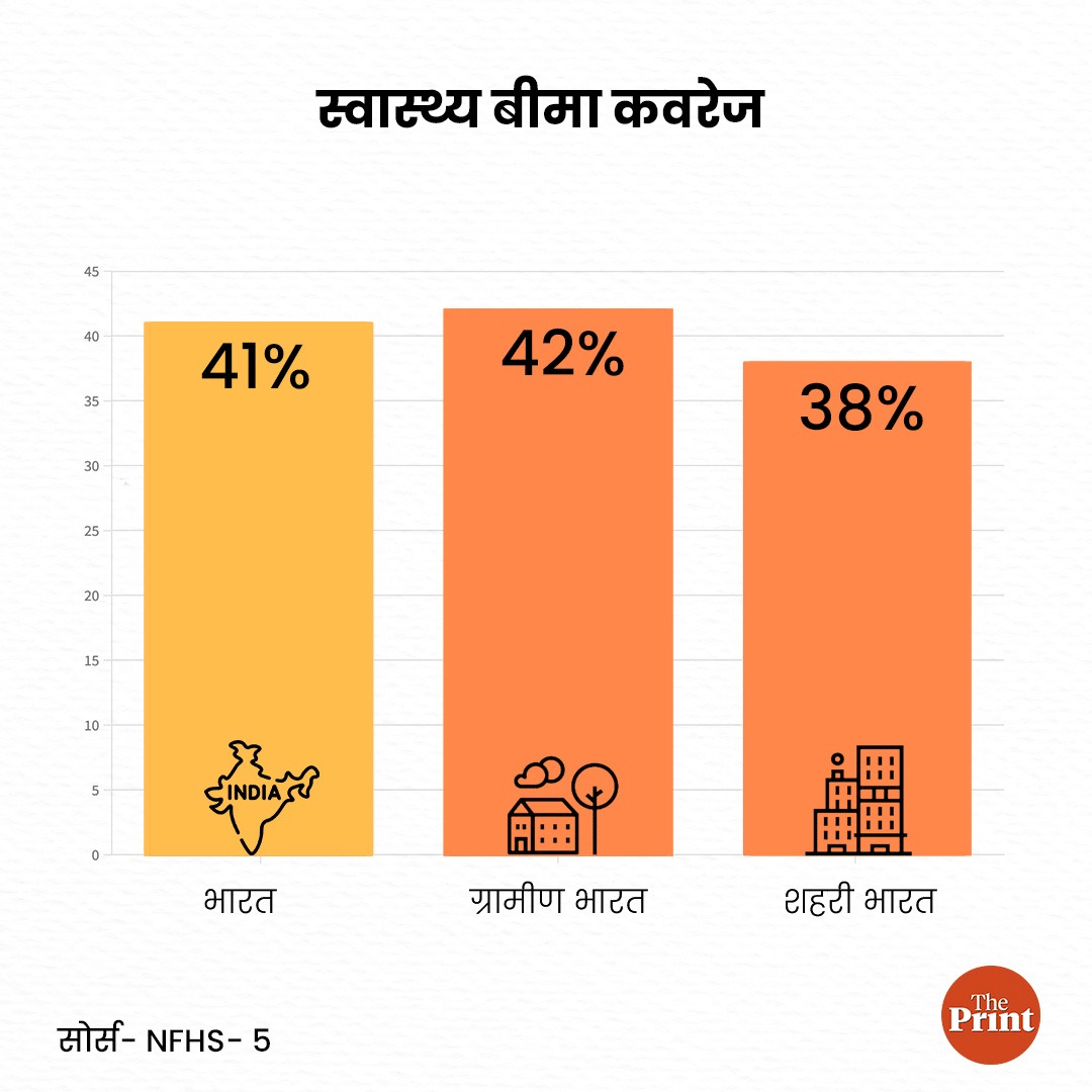 दिलचस्प है कि भारत के ग्रामीण इलाकों की 42 प्रतिशत आबादी किसी न किसी स्वास्थ्य बीमा से जुड़ी योजना का लाभ ले रही है वहीं शहरों में ये आंकड़ा 38 प्रतिशत है. 26.8 प्रतिशत शहरी महिलाएं और 31.2 प्रतिशत ग्रामीण महिलाएं स्वास्थ्य बीमा कवरेज के अंतर्गत आती हैं. वहीं पुरुषों में ये आंकड़ा 30.2 प्रतिशत और 35 प्रतिशत है.