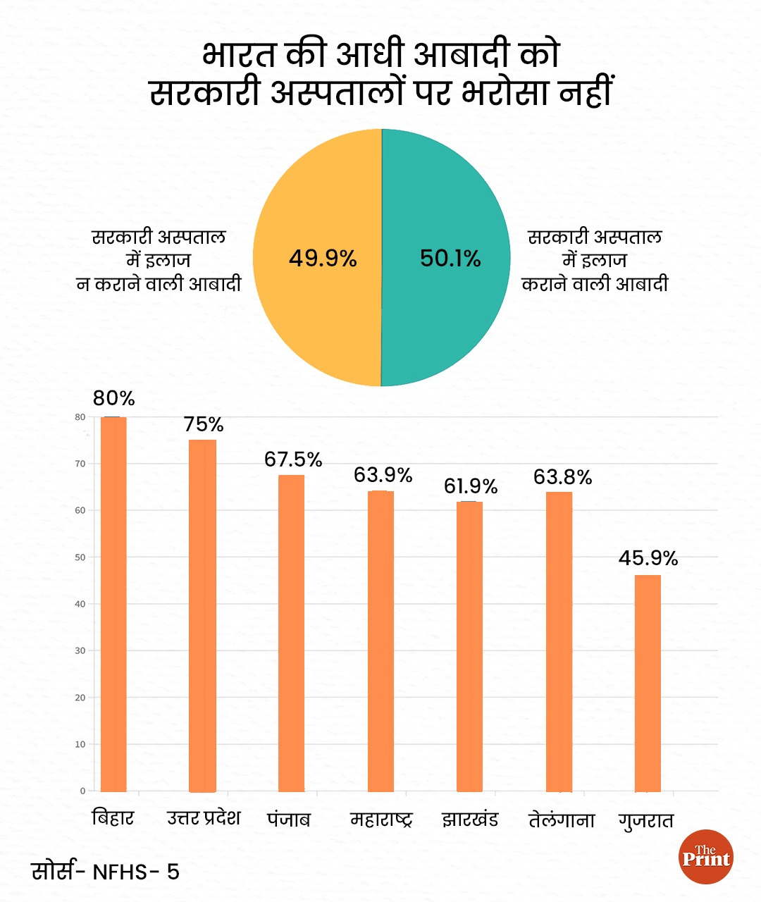 पंजाब के 67.5 प्रतिशत, उत्तराखंड के 55.7 प्रतिशत, उत्तर प्रदेश के 75 प्रतिशत, बिहार के 80.2 प्रतिशत, झारखंड के 61.9 प्रतिशत, महाराष्ट्र के 63.9 प्रतिशत, तेलंगाना के 63.8 प्रतिशत, गुजरात के 45.9 प्रतिशत परिवार सरकारी स्वास्थ्य सुविधाओं का इस्तेमाल नहीं करते हैं.