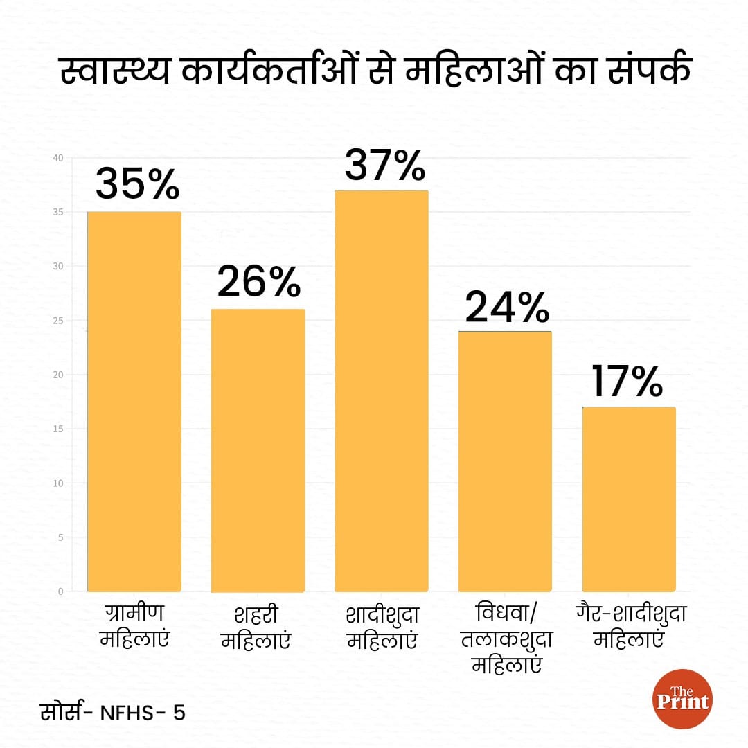 शादीशुदा महिलाएं ज्यादातर टीकाकरण के संबंध में या अपने बच्चों की बीमारी, डिलीवरी के सिलसिले में स्वास्थ्य कार्यकर्ताओं से मिलती हैं. एनएफएचएस-4 के 24 प्रतिशत की तुलना में एनएफएचएस-5 के अनुसार 32 प्रतिशत महिलाओं का स्वास्थ्य कार्यकर्ताओं से संपर्क होता है.
