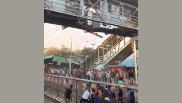 #WATCH | Slabs fall off of a foot over bridge at Balharshah railway junction in Maharashtra's Chandrapur; people feared injured pic.twitter.com/5VT8ry3ybe