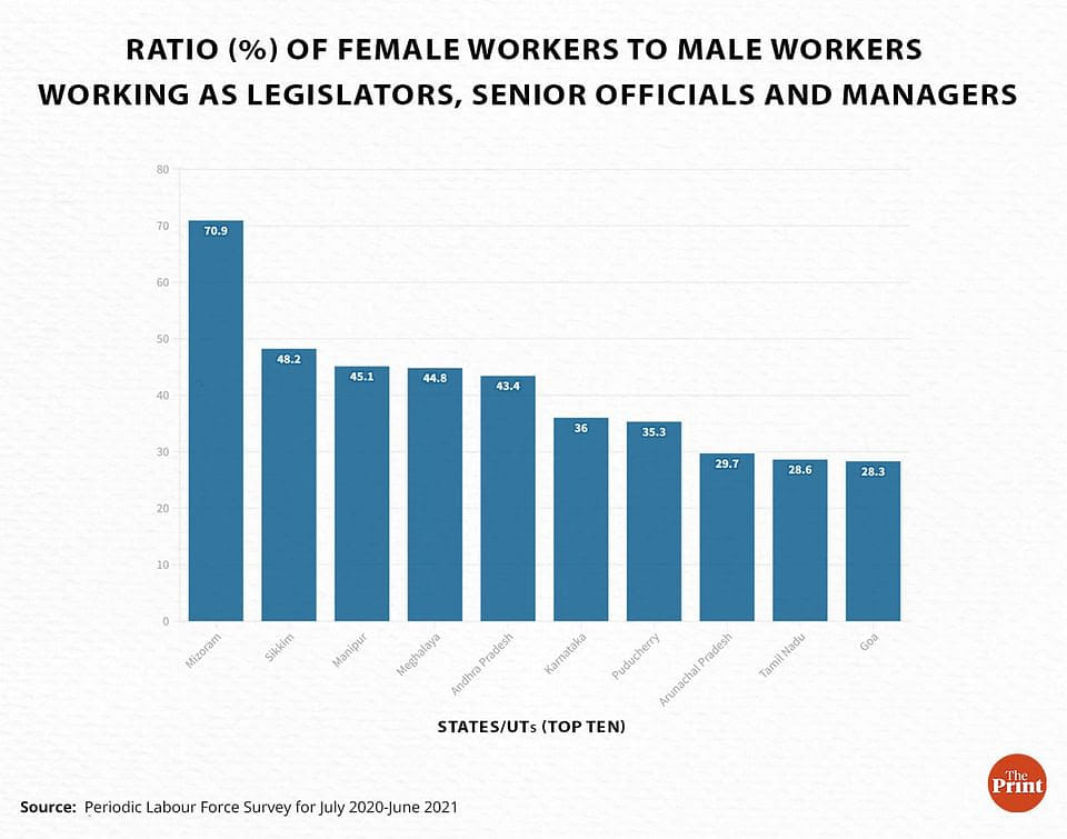 पिछले माह जारी पीएलएफएस सर्वेक्षण में पाया गया कि 70.9 प्रतिशत के साथ महिला-से-पुरुष श्रमिकों का शीर्ष अनुपात (प्रतिशत में मापा गया) मिजोरम में पाया गया है जो देश में विधायक, वरिष्ठ अधिकारी और प्रबंधक आदि हैं.