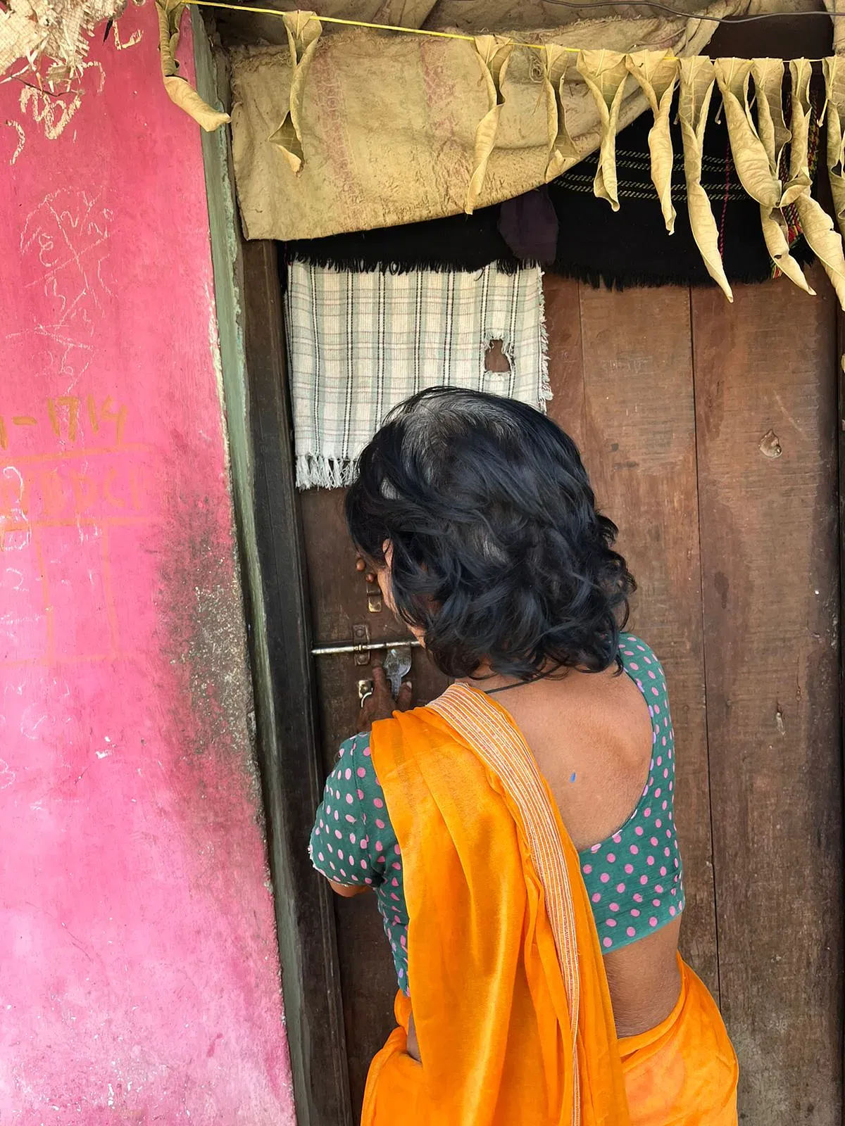 हरे रंग के ब्लाउज के साथ चमकीले नारंगी रंग की साड़ी पहने मथुरा ने साधारण ढंग से हमारा स्वागत किया. उसका बेटा अपने पालतू कुत्ते मोती को शांत करता है जो दरवाजे पर अजनबियों की दस्तक के साथ ही भौंकने लगता है. वह हमें चाय पिलाना चाहता था लेकिन घर में दूध ही नहीं था.