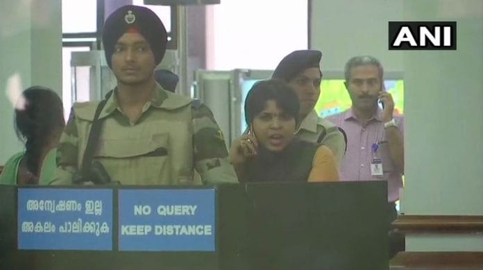 Kochi: Trupti Desai, founder of Bhumata Brigade, at Cochin International Airport. Protests are underway outside the airport against her visit to #SabarimalaTemple. #Kerala pic.twitter.com/T3y1JEj8ZH