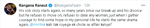 कंगना आगे ट्वीट में लिखती हैं, पंजाब और हरियाणा में फिर से सिसकियां शुरू होती हैं. हमारे ब्रेकअप और उसके तलाक को काफी समय हो गया है लेकिन उसने आगे बढ़ने से इनकार कर दिया है. किसी महिला को डेट करने से इनकार कर दिया है. जब भी मैं अपनी निजी जिंदगी में कुछ आगे बढ़ने के लिए साहस जुटाती हूं वह वही ड्रामा फिर से शुरू कर देता है. ऋतिक कब तक करोगे एक छोटे से अफेयर के लिए ये सब?