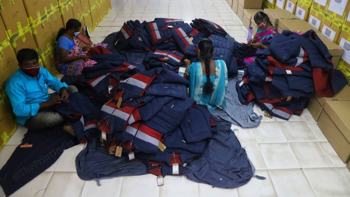 वारसा इंटरनेशनल गारमेंट फ़ैक्टरी के सिलाई वाले अनुभाग में, अपने काम के प्रति उत्सुक श्रमिकों को एक साफ-सुथरी पंक्ति में बैठाया जाता है. सोमवार को जब दिप्रिंट ने इस परिसर का दौरा किया तो कमरा खचाखच भरा हुआ था.