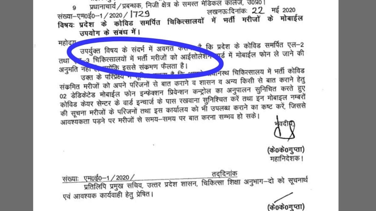 यूपी सरकार के पूर्व चीफ मेडिकल ऑफिसर डाॅ. अशोक मिश्रा ने दिप्रिंट को बताया, ‘इस तरह के निर्देश का कोई लाॅजिक नहीं’ है. पूर्व सीएमओ ने कहा, ‘मोबाइल पास न होने से मरीज और भी परेशान हो सकता है, वह डिप्रेशन में भी जा सकता है. ऐसे में मोबाइल जरूरी है.’ वैसे भी ये फैसले मेडिकल एजुकेश़न डिपार्टमेंट के नहीं बल्कि एडमिनिस्ट्रेशन से जुड़े हैं’.