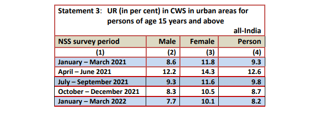 बेरोजगारी दर और श्रम शक्ति भागीदारी दर के आंकड़े केंद्र सरकार द्वारा गुरुवार को आवधिक श्रमबल सर्वेक्षण की त्रैमासिक बुलेटिन में जारी किए गए हैं. जिसमें जनवरी-मार्च 2022 के आंकड़े शामिल हैं.