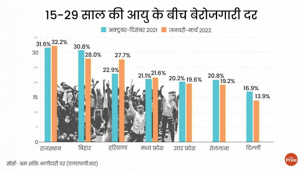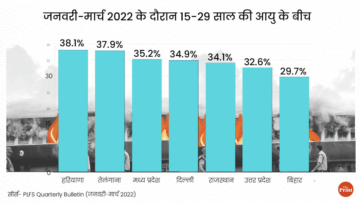 दिप्रिंट उन 7 राज्यों में जनवरी-मार्च 2022 के दौरान बेरोजगारी दर और श्रम शक्ति भागीदारी दर (एलएफपीआर) के आंकड़ों का विश्लेषण किया है, जहां अग्निपथ योजना के खिलाफ युवा प्रदर्शन कर रहे हैं. ये राज्य हैं- बिहार, उत्तर प्रदेश, राजस्थान, मध्य प्रदेश, तेलंगाना, हरियाणा और दिल्ली.