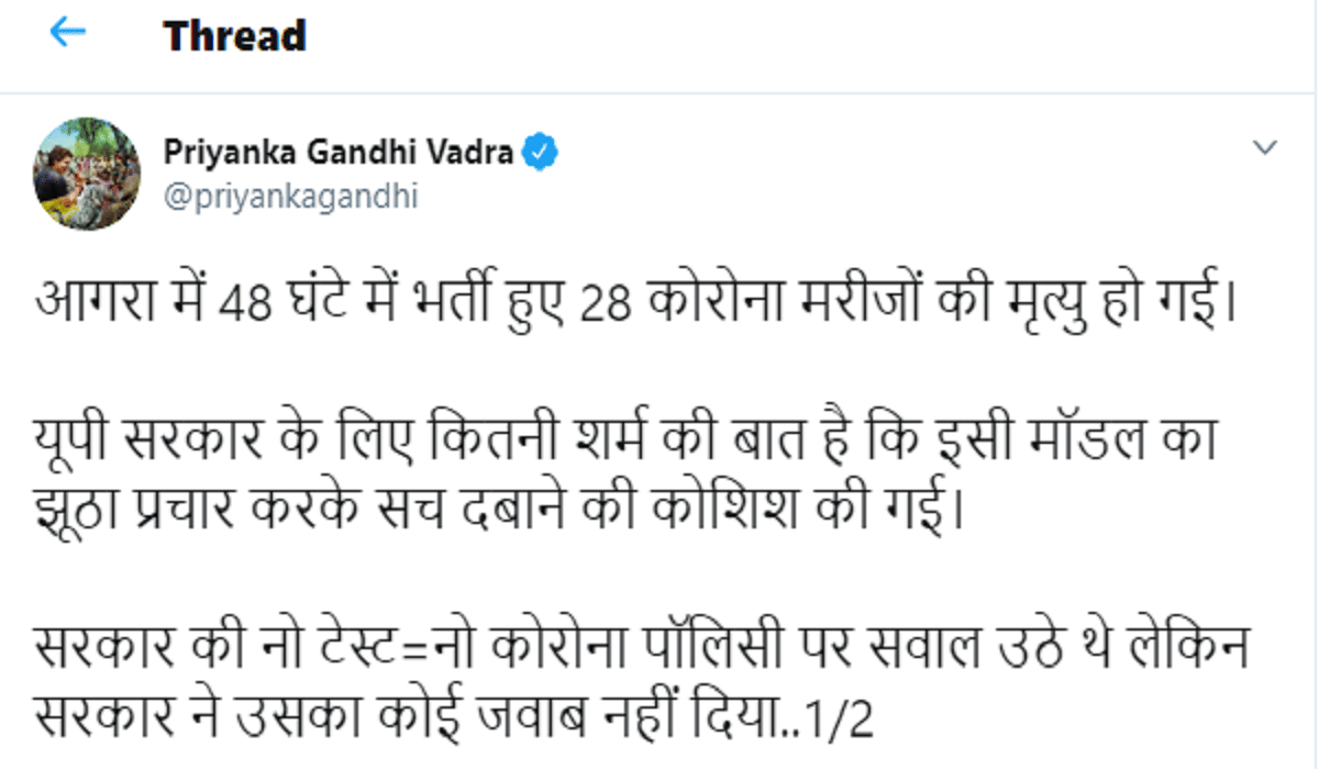 कांग्रेस महासचिव ने दोबारा ट्वीट कर आगरा में दिल्ली-मुंबई से ज्यादा मौत की बात कही है और आगरा मॉडल को झूठा करार दिया है.