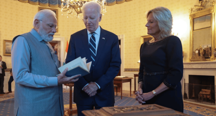 प्रधान मंत्री नरेंद्र मोदी ने वाशिंगटन, डीसी में व्हाइट हाउस में संयुक्त राज्य अमेरिका के राष्ट्रपति जो बाइडन और फर्स्ट लेडी जिल बाइडन के साथ विशेष उपहारों का आदान-प्रदान किया.