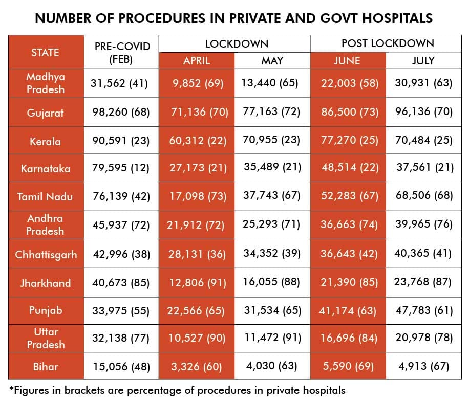 फरवरी में, गुजरात के कुल 98,260 क्लेम्स में से, 68 प्रतिशत निजी अस्पतालों से थे. जुलाई में ये संख्या कुल 96,136 क्लेम्स का 70 प्रतिशत थी. केरल में, कुल 70,484 दावों में निजी अस्पतालों की हिस्सेदारी बढ़कर 25 प्रतिशत हो गई, जो पहले कुल 90,591 दावों का 23 प्रतिशत थी. सरकारी अस्पतालों के क्लेम्स फरवरी में 69,755 के मुक़ाबले, जुलाई में घटकर 52,863 पर आ गए.