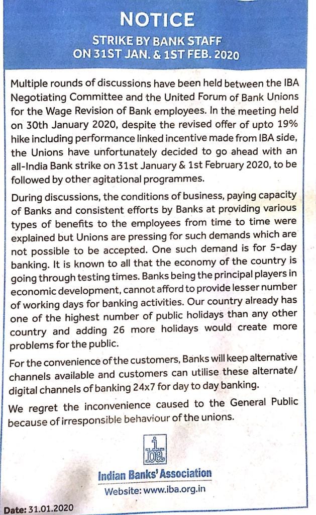 वहीं इंडियन बैंक्स असोसिएशन ने अपना पक्ष रखते हुए प्रमुख अखबारों में विज्ञापन निकाले हैं, जिनमें कहा गया है कि उनकी तरफ से कर्मचारियों के वेतन में 19 प्रतिशत वृद्धि, जिसमें कार्यक्षमता से जुड़े इंसेंटिव शामिल हैं की पेशकश की गई थी जिसके बावजूद बैंक कर्मचारियों ने हड़ताल पर जाने का फैसला किया है.