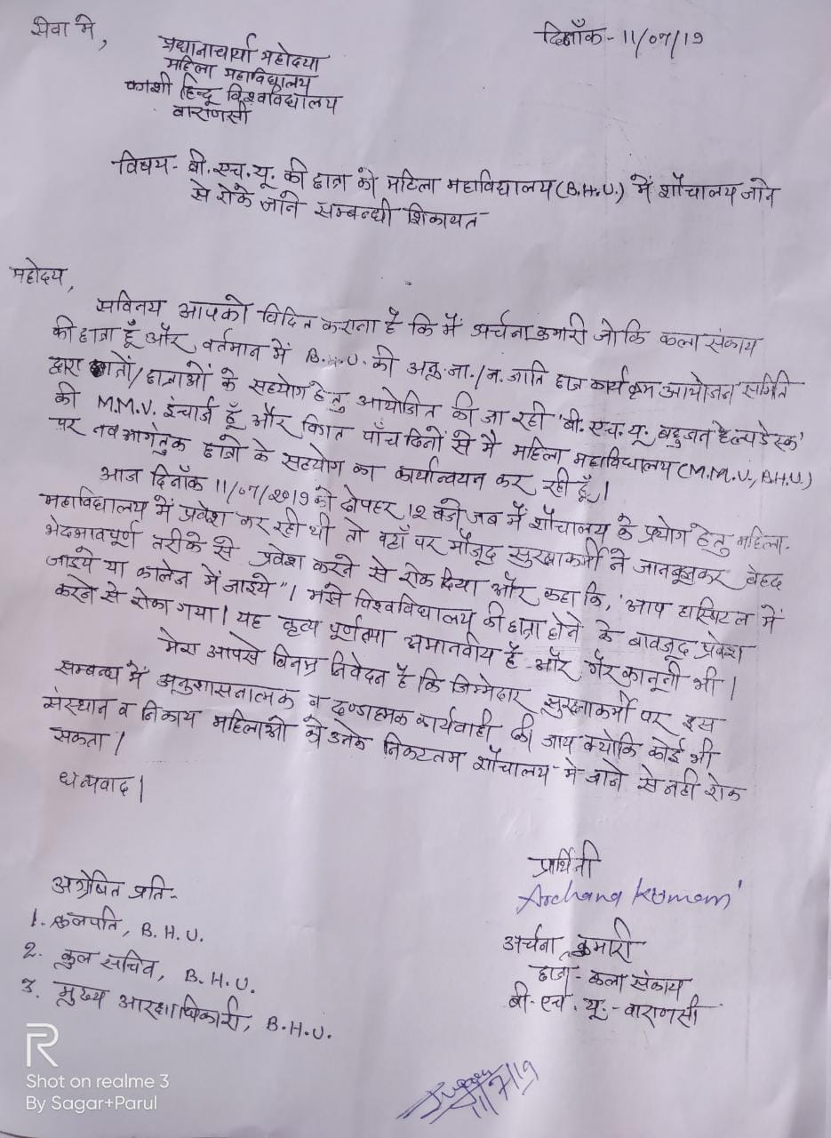 एमएमवी गेट के पास हेल्प डेस्क पर छात्रों की मदद कर रही छात्रा ने आरोप लगाया है कि गार्ड ने उसे दलित होने के कारण शौचालय जाने से रोक दिया. छात्रा ने बताया कि किसी भी महिला को निकटतम शौचालय में जाने से रोकना न सिर्फ अमानवीय है, बल्कि गैर कानूनी भी है. इसके अलावा किसी छात्र को विश्वविद्यालय की मूलभूत सुविधाओं से वंचित करना पूर्णत: अमानवीय है. तरह से रोका जाना दलित छात्रा ने गार्ड के खिलाफ अनुशासनात्मक व दंडात्मक कार्रवाई की मांग की है.