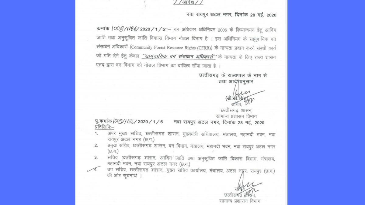 छ्त्तीसगढ़ सरकार ने सामुदायिक वन संसाधन अधिकार के लिए वन विभाग को नोडल एजेंसी बनाए जाने के अपने पूर्व आदेश को वापस ले लिया है. सरकार द्वारा 1 जून को जारी नए आदेश में वन विभाग को नोडल एजेंसी के स्थान पर समन्वय का कार्य सौपा गया है. इस सबंध में राकेश चतुर्वेदी ने दिप्रिंट से कहा, ‘पहले जारी आदेश में कुछ कमी थी जिसे ठीक कर लिया गया है. वन विभाग का काम मात्र समन्वय का रहेगा.’