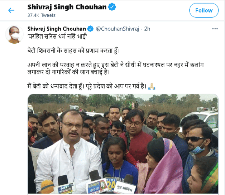 मुख्यमंत्री चौहान ने ट्वीट किया, ‘परहित सरिस धर्म नहिं भाई’. बेटी शिवरानी के साहस को प्रणाम करता हूं. अपनी जान की परवाह नहीं करते हुए इस बेटी ने सीधी में घटनास्थल पर नहर में छलांग लगाकर दो नागरिकों की जान बचाई है. मैं बेटी को धन्यवाद देता हूं. पूरे प्रदेश को आप पर गर्व है.’