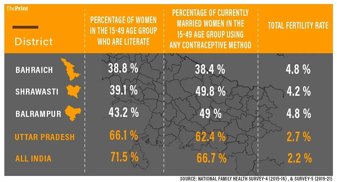 एनएचएफएस-4 के आंकड़ों के मुताबिक, बहराइच में कुल प्रजनन दर (टीएफआर)—यानी प्रति महिला पैदा होने वाले बच्चों की औसत संख्या- यूपी में सबसे ज्यादा 4.8 है, जो राज्य की 2.7 और देश की औसत दर 2.2 से बहुत अधिक है. इसी तरह बलरामपुर में भी टीएफआर 4.8 के साथ सबसे ज्यादा है, उसके बाद श्रावस्ती का नंबर है जहां टीएफआर 4.2 है.