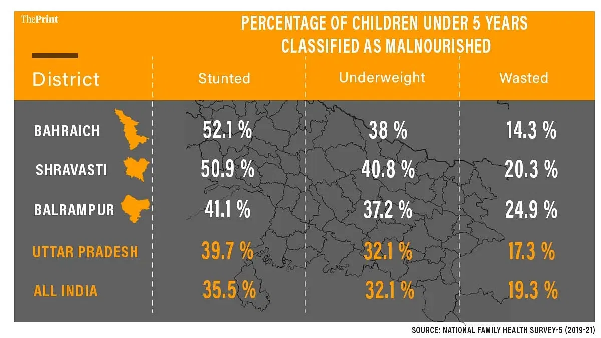 एनएफएचएस-5 के मुताबिक, बहराइच में पांच साल से कम उम्र के 52 प्रतिशत बच्चे शारीरिक रूप से अल्प विकसित, 38 प्रतिशत अल्प वजन वाले हैं और 14.3 प्रतिशत ‘कमजोर’ हैं.
